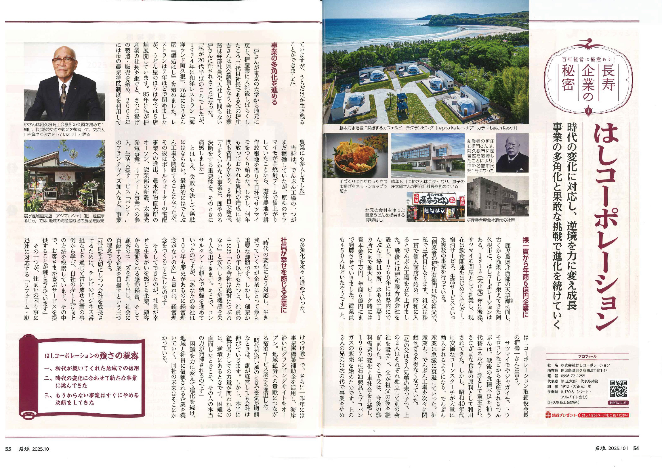 誌面では、1912年の創業以来、地域に根ざして歩んできた当社の歴史や、さつま揚げ製造をはじめ、飲食事業、グランピング施設「napoo ka la(ナプーカラ)」の運営など、多角的な事業への挑戦について取り上げていただいています。
